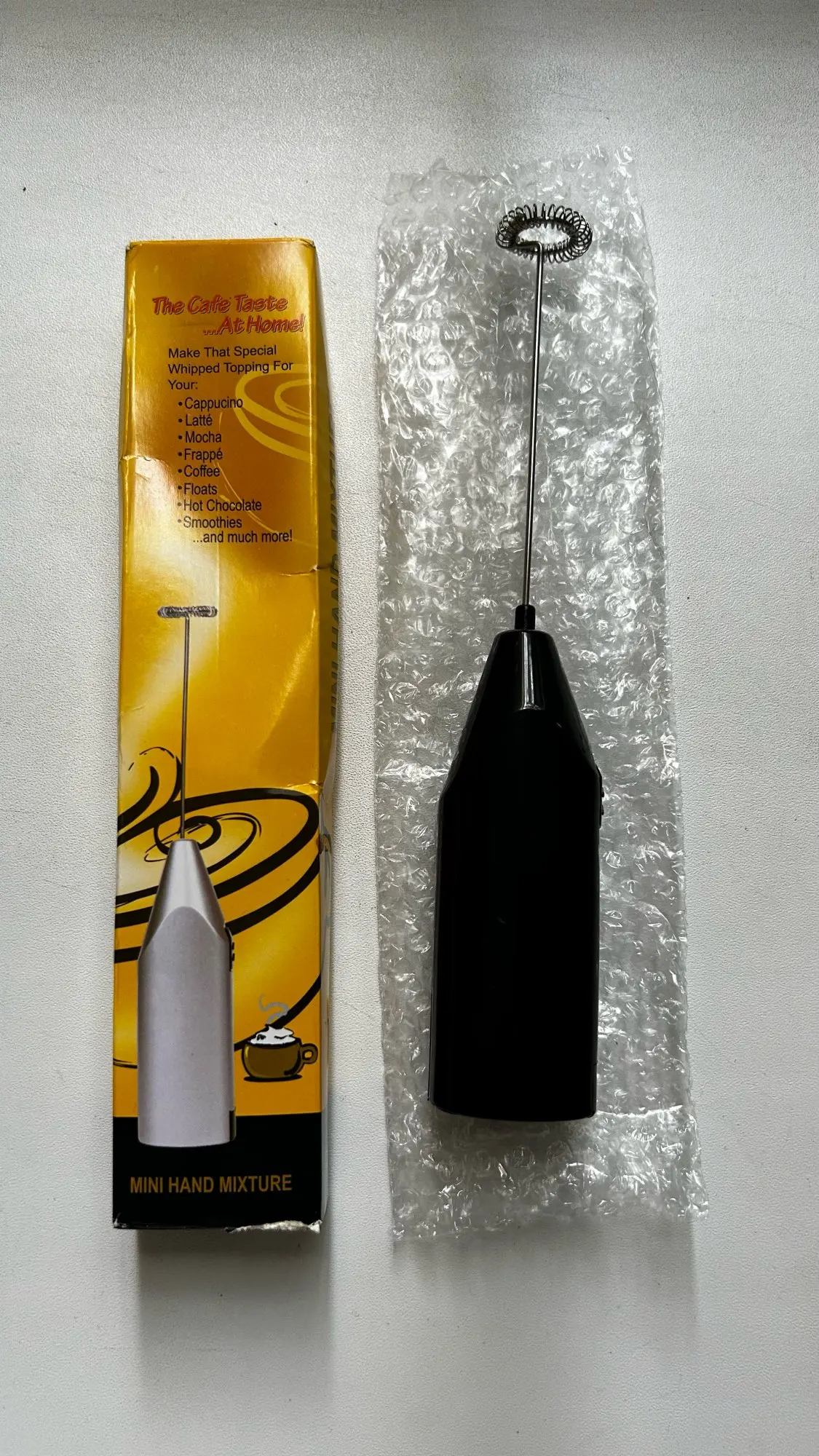 Feature: Non-stick, flexible and easy to handle Stainless steel spring and the body is made of abs plastic Simple on/off button for easy operation Egg beater will not damage cookware or bowls Easy to clean with a damp cloth; Make your milk all frothy, great for making cappuccino, white coffee and milk shake at home Can be also used for crack egg, quickly mush eggs without spilt around.